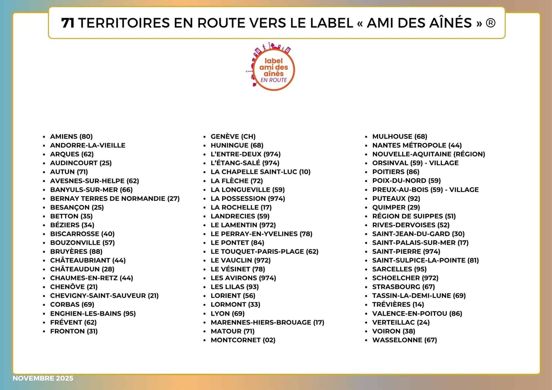 Le LABEL « AMI DES AÎNÉS »® est un outil complémentaire destiné à toutes les collectivités – communes, intercommunalités, départements ou régions – adhérentes au Réseau Francophone des Villes Amies des Aînés, qui souhaitent s’engager dans une démarche de progrès au service des aînés. Inspiré du programme de l’Organisation Mondiale de la Santé (OMS), il a été conçu à partir des expériences de terrain, des retours d’évaluation et d’une vaste consultation des retraités français.
